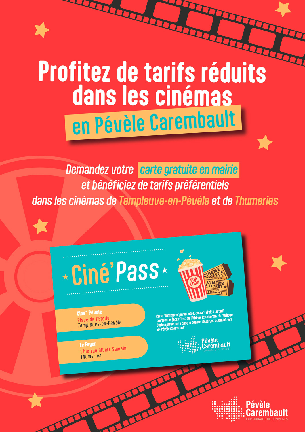Cette carte gratuite vous permet de bénéficier de tarifs préférentiels dans les cinémas de Thumeries (5.5€ la séance) et de Templeuve-en-Pévèle (6.5€ la séance).